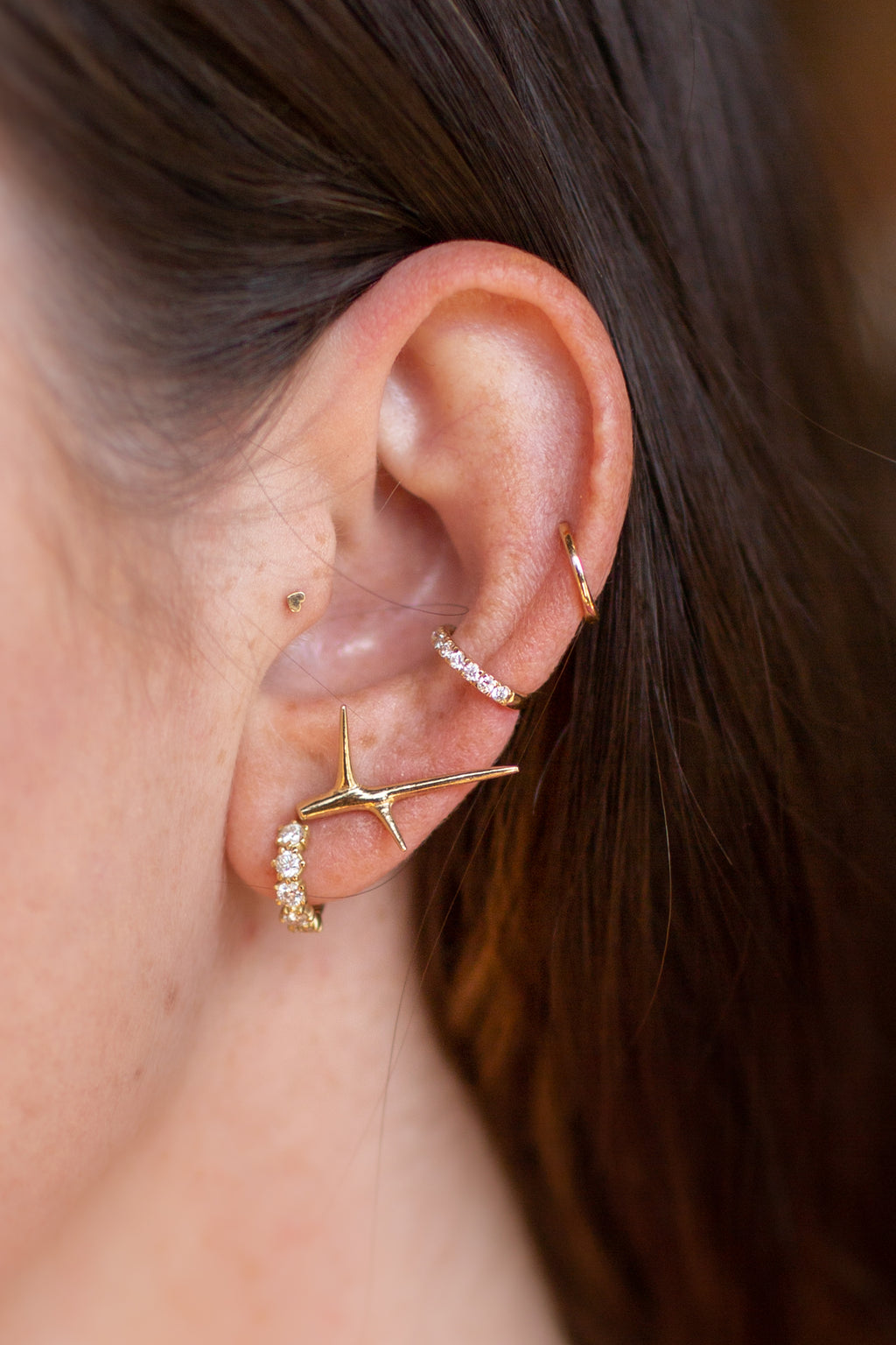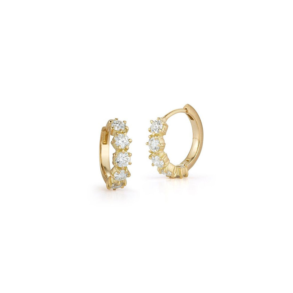 These petite Catherine Mini Huggie Earrings feature 5 brilliant-cut diamonds mounted in Jade's signature Catherine six-prong setting. Handcrafted in 18-karat gold, the combination of matte finish and knife-edge technique bring a modern feel to these everyday earrings.