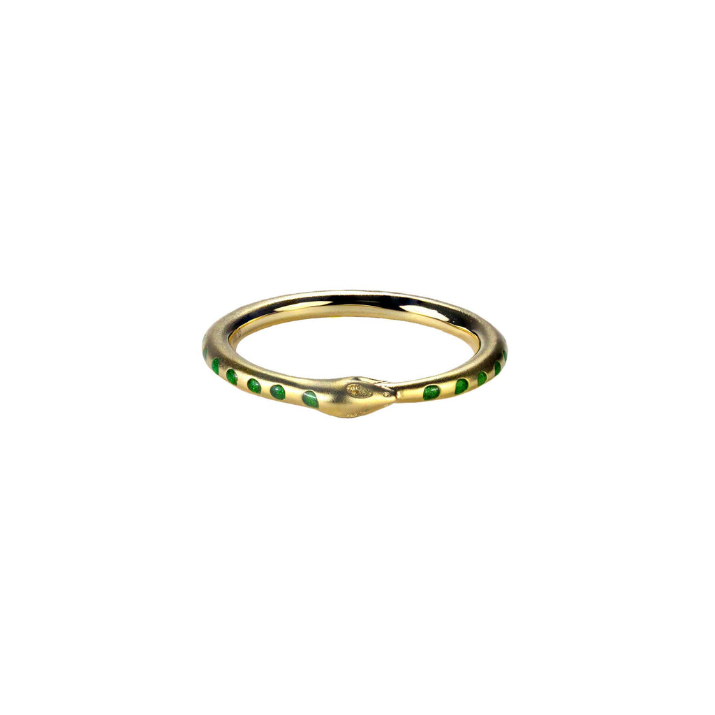 18K yellow gold and green enamel spotted thin ouroboros snake ring, finger size 7.