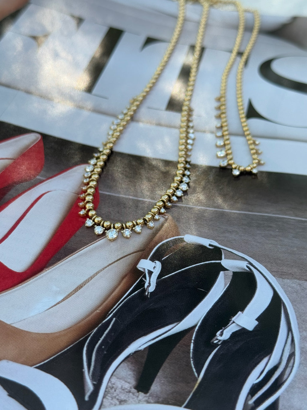 Undulating diamonds float between golden spheres, striking the perfect balance between industrial and delicate. The movement created by the free floating settings gives the illusion of diamond droplets dancing on the skin. The Kin Necklace is the perfect compliment to a t-shirt or an evening gown.