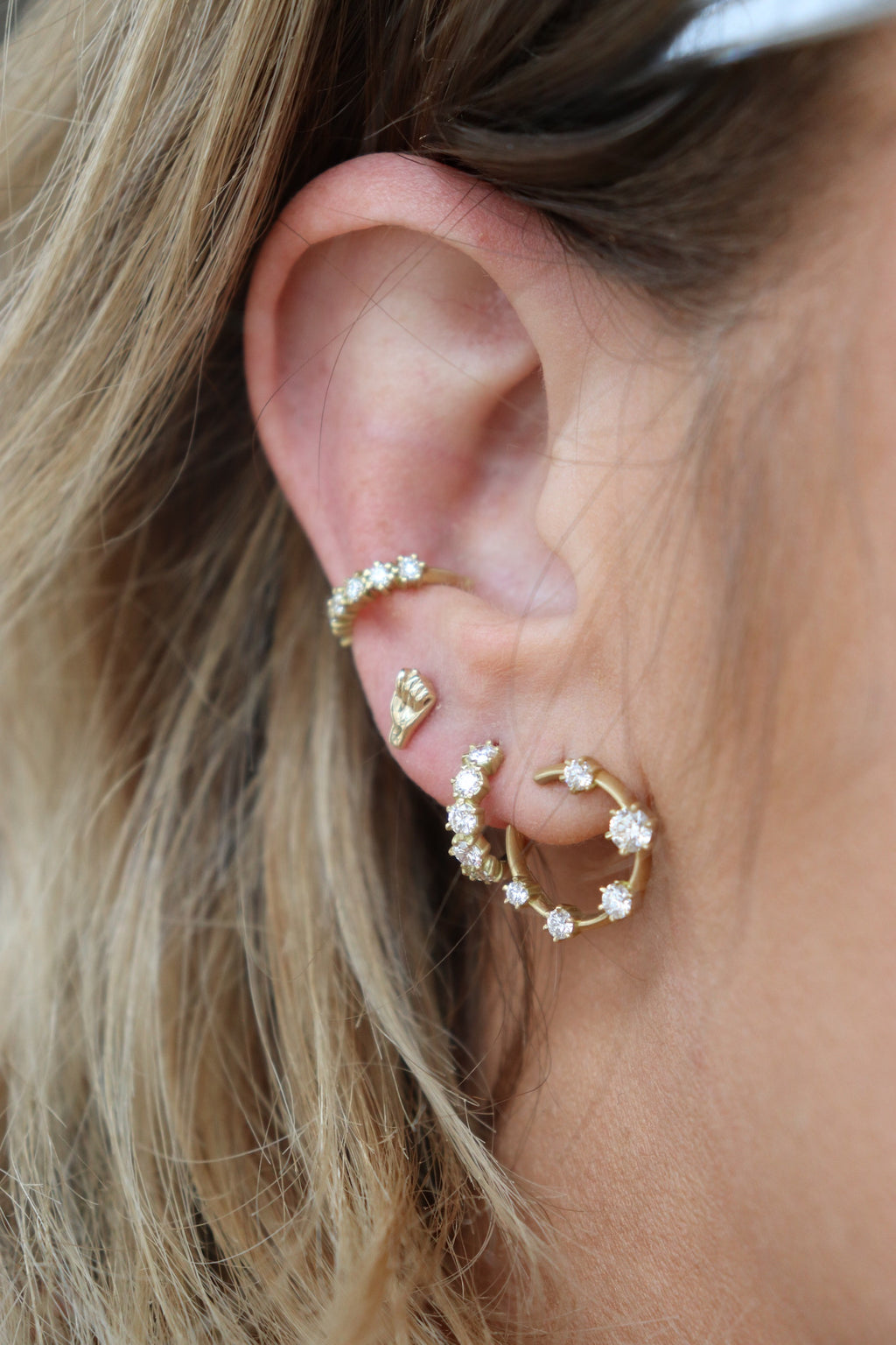 Jade Trau's signature Kismet Hoops are a new kind of hoop to add to your collection. The end of the hoop silhouette is crafted to slightly bend inward creating a modern, dimension feel.