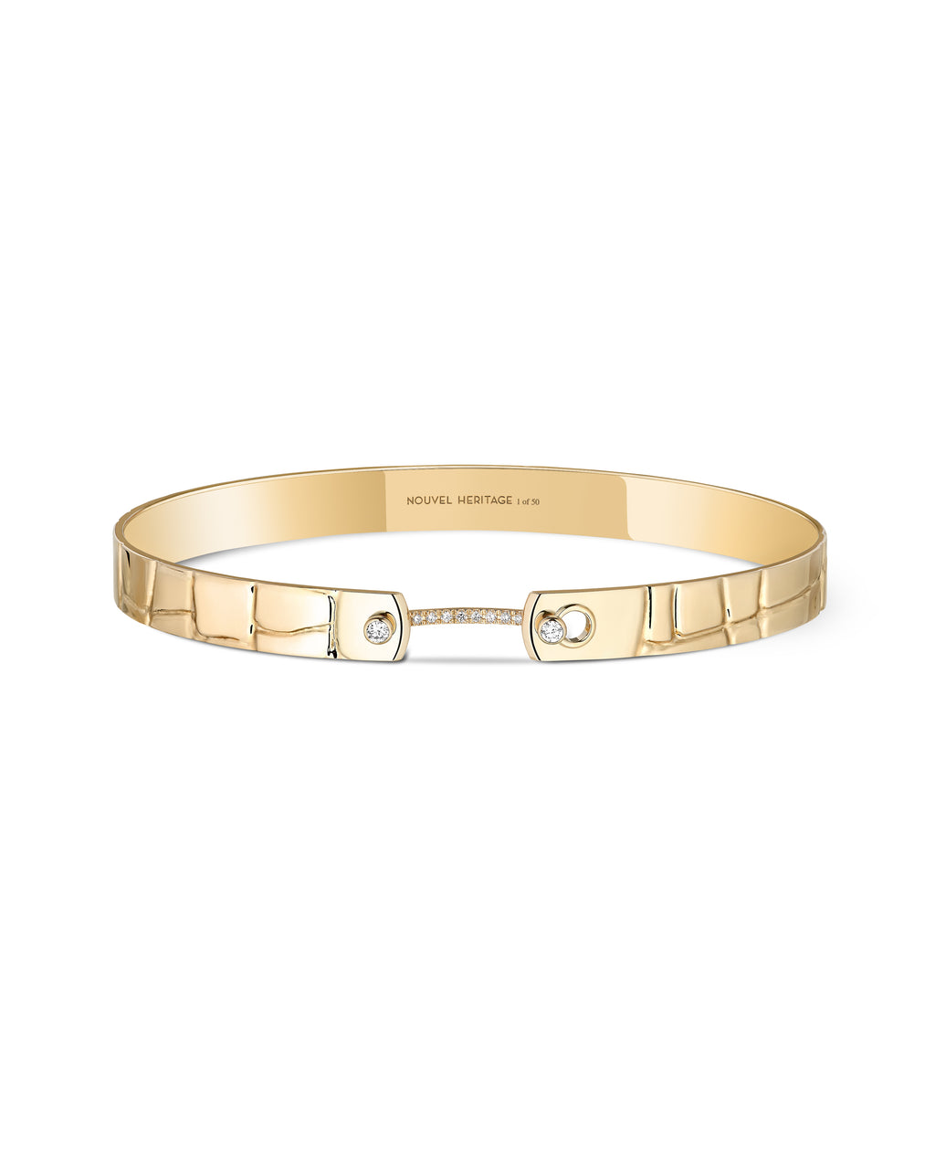 The limited edition Later Alligator bangle combines artisanal savoir-faire and innovation in a piece built to intrigue. After a year of development, our artisans pushed technique further to create a trompe-l’oeil alligator effect in 18-karat yellow gold. The texture is precise and graphic, anchored by the Mood collection’s signature piercing detail.