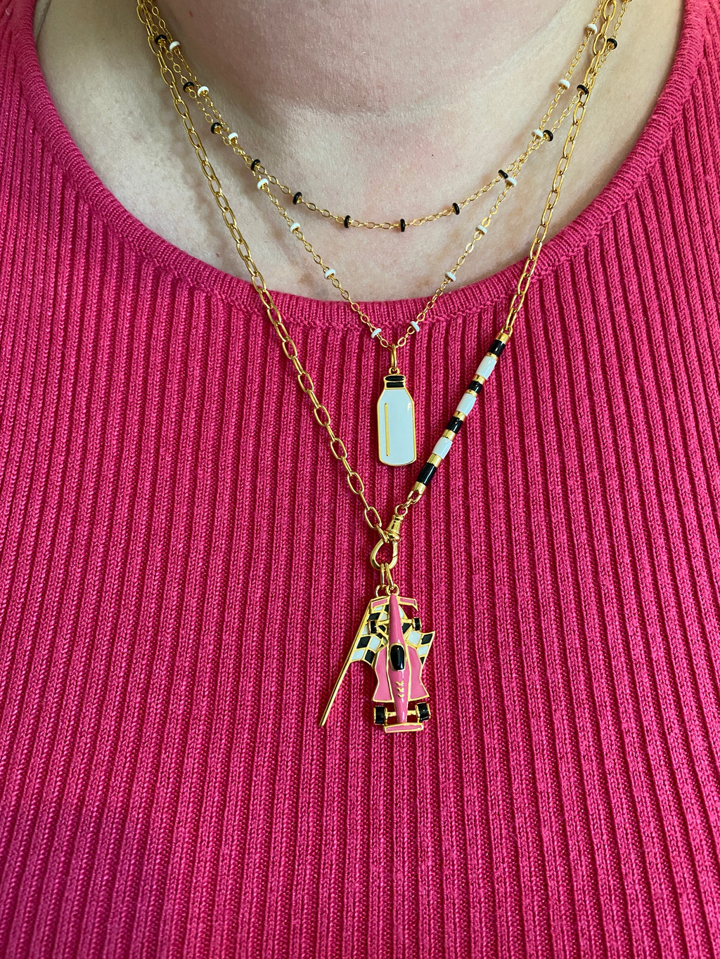 This race car is a must-have for any race fan. It looks great on the barrel chain or layered with a checkered flag!