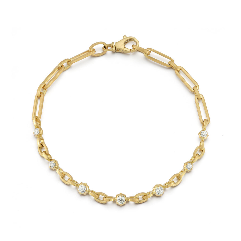 The Pippa Bracelet features a sleek silhouette is complimented by alternating diamond and chain links for a modern spin on classic chain bracelet designs. Handcrafted in 18-karat gold and accented by 7 round, brilliant-cut diamonds, the Pippa Chain Bracelet can be easily paired with other stacking bracelets and can be worn for any ocassion.