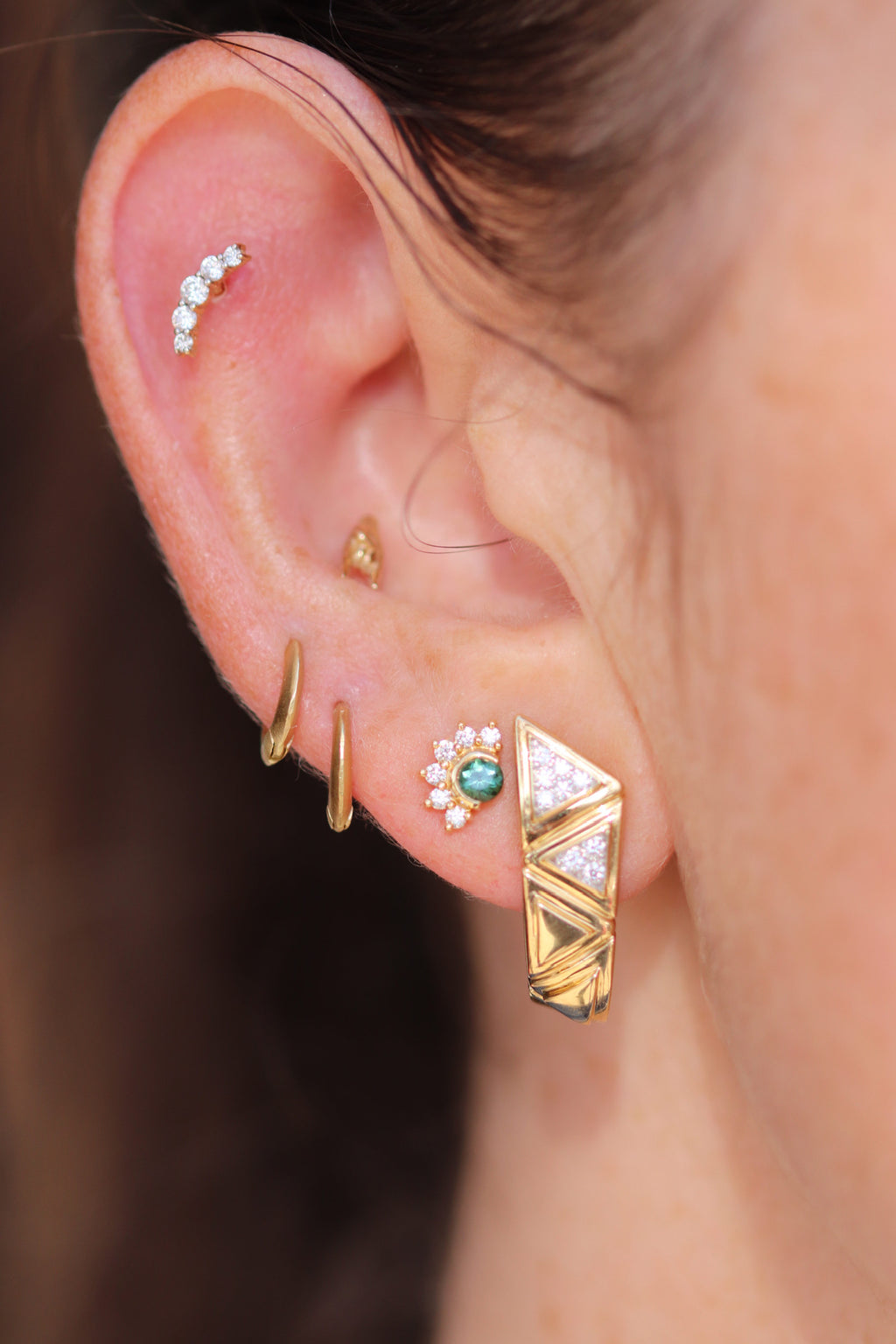 18k yellow gold Triangolini diamond huggie with diamond pave triangles, 0.17ctw white diamonds.